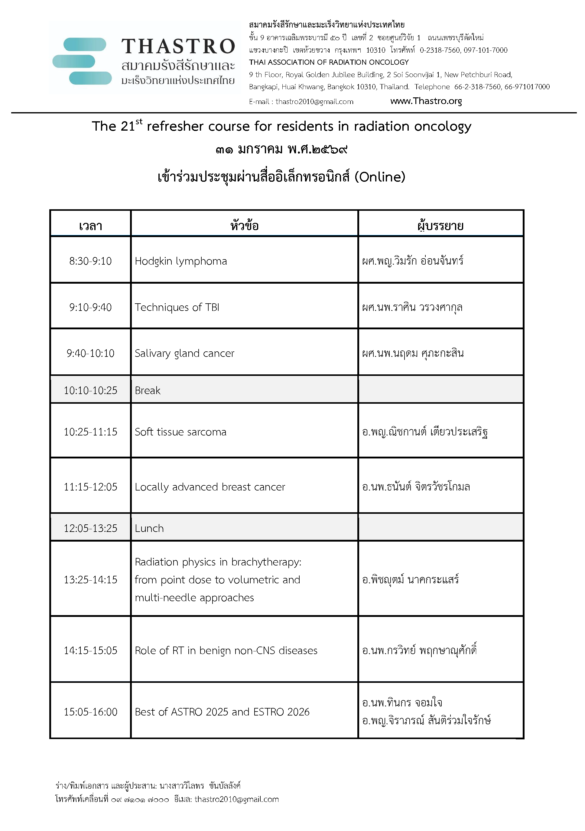 The 21st refresher course for residents in radiation oncology
